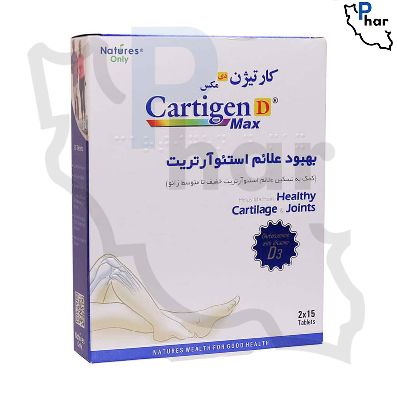 قرص کارتیژن دی مکس نیچرز اونلی سبب ترمیم غضروف و مفاصل و تقویت آن‌ها می‌شود. استئوآرتریت یا ساییدگی مفاصل از بیماری‌های شایعی است که با گذر سن ایجاد می‌شود. در این بیماری غضروف‌های مفاصل ساییده شده و کارکرد اصلی خود را از دست می‌دهند. این افراد می‌توانند از مکمل‌های حاوی گلوکوزامین استفاده کنند تا غضروف‌ها ترمیم شده و درد مفاصل از بین برود. همچنین با مصرف آن شاهد خواهید بود که دردهای مفصلی کاهش یافته و از التهابات ناشی از آن نیز پیشگیری می‌شود. کارتیژن دی مکس حاوی گلوکزامین سولفات پتاسیم و ویتامین D3 است. گلوکزامین موجود در این فراورده به شکل کریستالی است که باعث جذب بهتر و عملکرد طولانی‌تر آن خواهد شد.